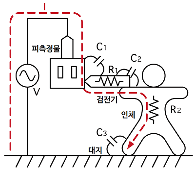 피측정물(콘센트 등)에 검전기를 연결한 경우 피측정물과 검전기의 사이에는 정전 용량이 생성됩니다. 동일하게 검전기와 인체, 인체와 대지 사이에도 정전 용량이 생성되어 피측정물이 활전 상태인 경우 검전기 및 인체를 경유하여 미세한 교류 전류가 흐릅니다.