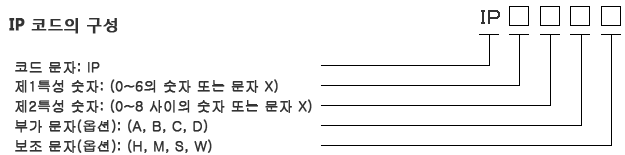 침범 요소(손과 손가락 등의 신체 일부), 먼지, 돌발적인 접촉, 수분에 대항하여 제공되는 보호 등급을 분류하고 등급를 매깁니다.