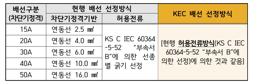 ㅇ 차단기 정격전류에 따라 일괄적으로 적용한 배선선정방식 폐지('21 시행)