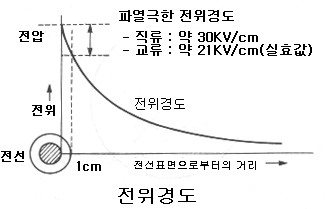송전선로의 전선표면의 근방에서처럼 전극간의 일부분에서만 전위의 경도가 위의 한계값을 넘을 때에는 그 부분에서만의 공기의 절연이 파괴되어 전체로서는 섬락에까지 이르지 않는다.