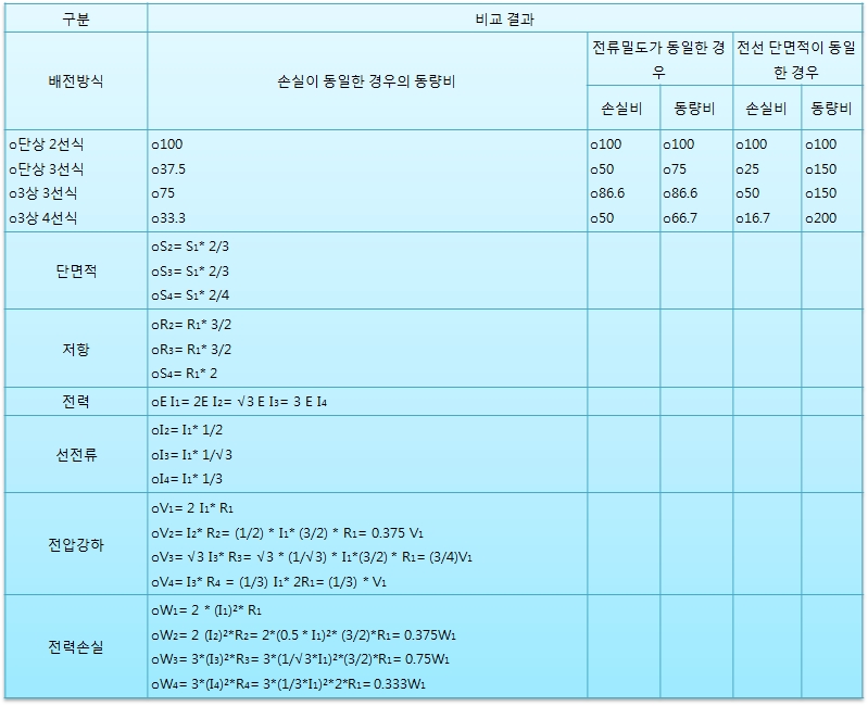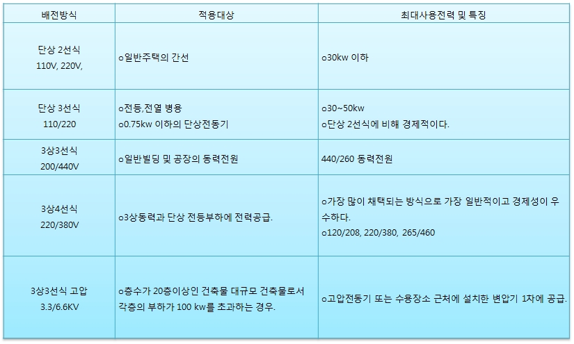 2) 배전방식은 변전설비, 배선, 분전반 등의 규모와 전력손실, 전선의 굵기, 및 허용 전압강하에 따라 각각 다르므로 동일한 부하 조건에서의 배전방식의 결정은 경제성이 좋은 단상3선 또는 3상4선으로 결정하는 것이 좋다.