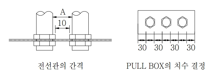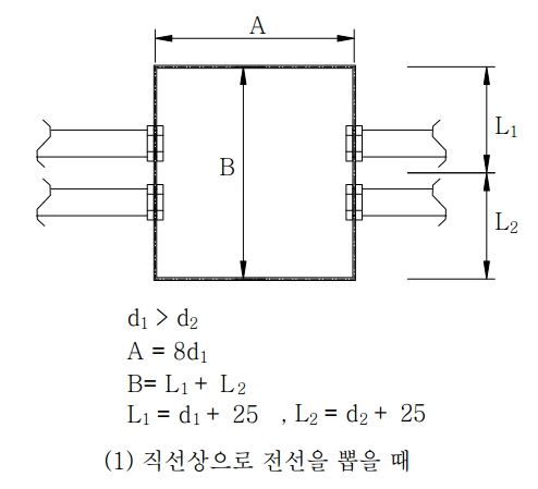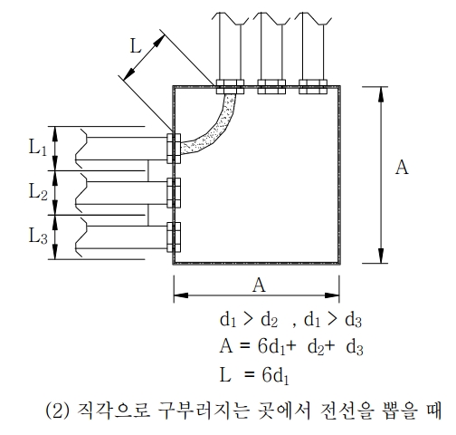 전선관이 접속된 측면과 반대쪽 측면과의 간격은 최대 관지름의 6배에 다른 관지름의 합을 가산한