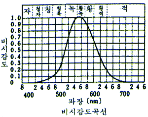 사람의 눈이 빛을 느끼는 전자파는 380~760㎚ 파장 범위이며 파장 555㎚에서 최대감도를 갖고 있다.