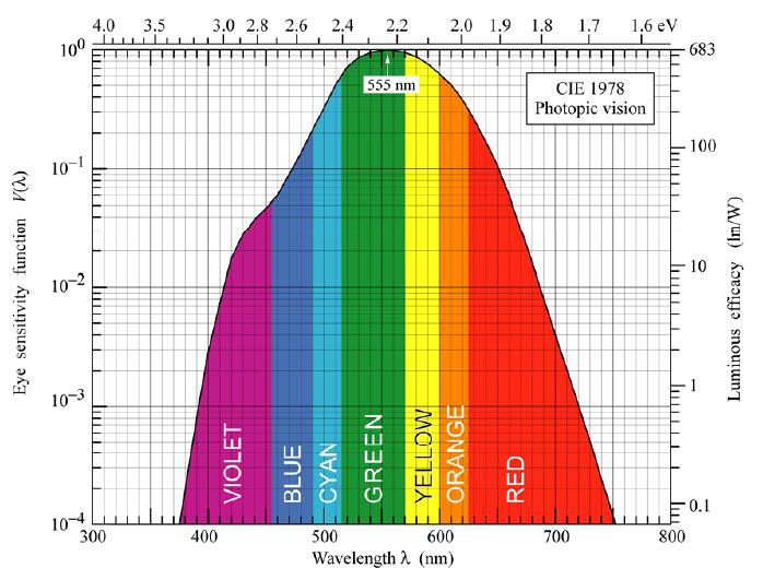 즉, 파장별로 밝기로서 느끼는 정도. 엄밀하게 개인차가 있으나 표준으로서 국제적(CIE)으로 통일되어 있다.