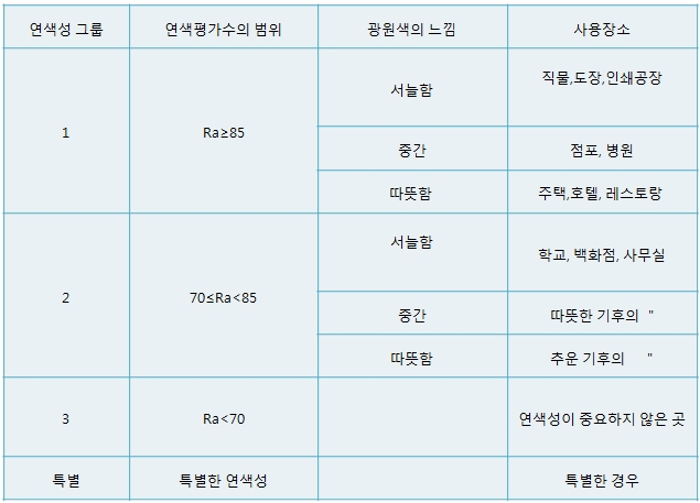 광원의 연색성은 원칙적으로 평규연색 평가수(Ra) 및 특수연색평가수(R9~R15)에 의해 평가한다.