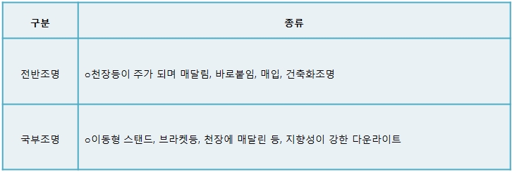 직접조명, 반 직접조명, 전반확산조명, 반 간접조명, 간접조명으로 분류된다.