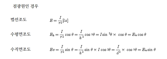 · 어떤 면 위의 임의의 1점에서 조도는 광원의 광도와 cosθ에 비례하고 거리의 제곱에 반비례 한다.