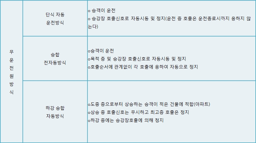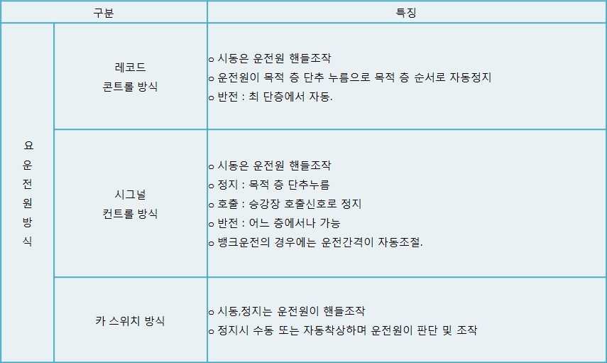 경제적인 운전을 위해 운전원이 없는 엘리베이터로 설계되고 있으며 대수 및 이용목적을 고려하여 운전방식을 선정하여야 하며, 3대 이상 설치시에는 일괄관리하는 군 관리방식을 고려하여 운전효율의 증대를 고려 한다.