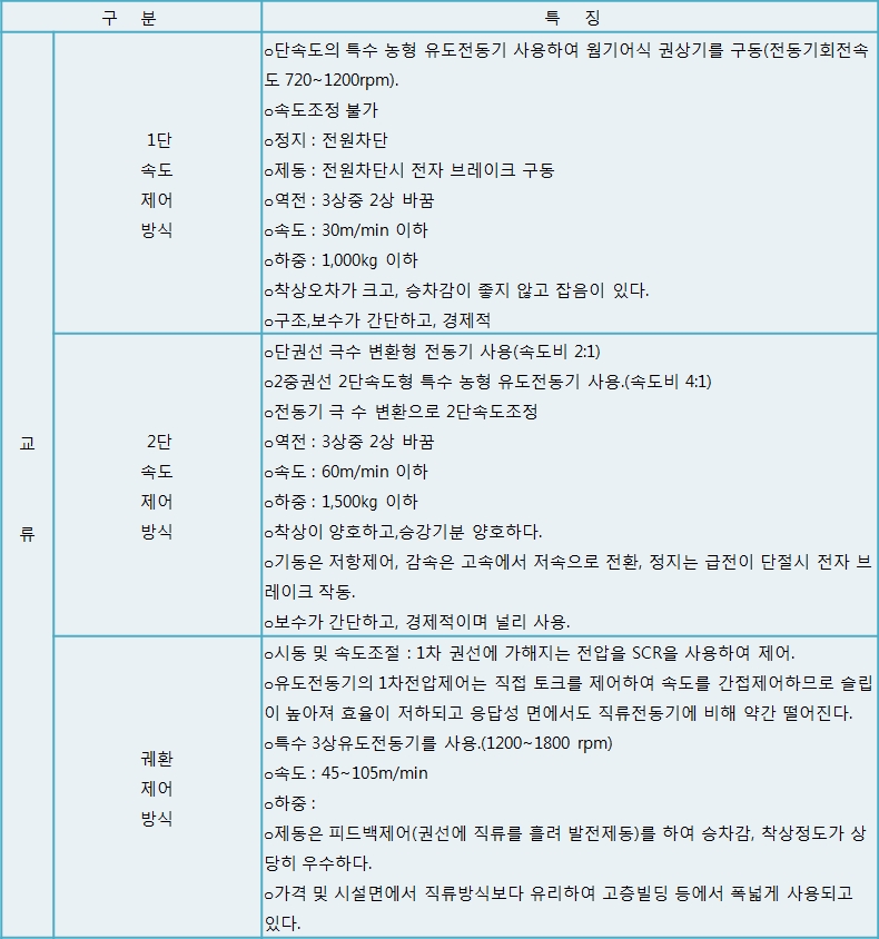 승객, 화물용 엘리베이터는 로프거리(1:1, 2:1)의 트랙션형이 사용된다.