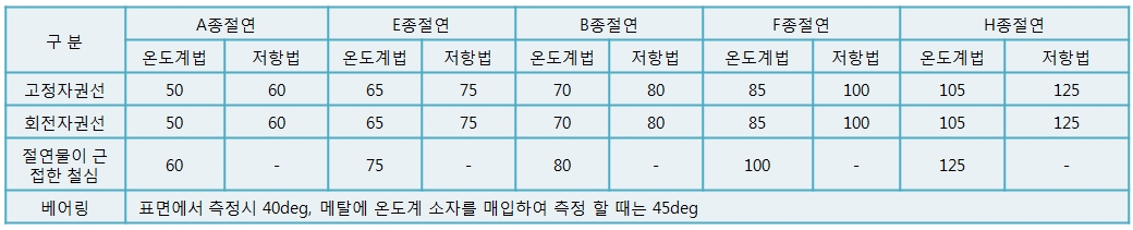 전기 용품 안전 관리 법에 의하면 권선부 온도는 주위온도 40℃에서 75deg이하로 규제되어 있으며 허용되는 온도차(Δt)는 아래 기준표를 참조 바랍니다.