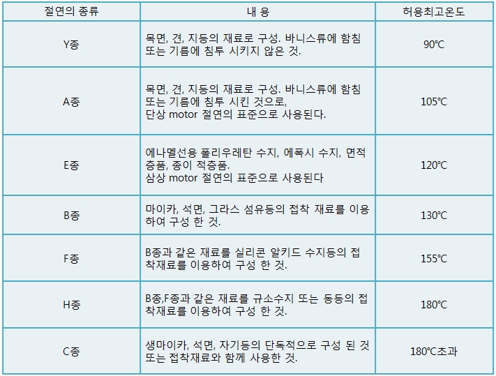 MOTOR의 사용한계는 주위온도와 MOTOR의 온도상승에 의해 제한되며, 각 절연 계급에 의한 MOTOR의 사용 온도 한계는 아래의 표와 같다.