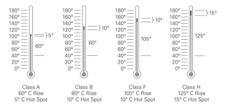 권선부의 최고 허용 온도가 절연 재료의 종류에 의해 K.S규격으로 규정되어 있으며 (상기의 표 "절연 계급에 따른 허용 최고온도" 참조) 일반적으로 E종 절연으로 120℃(주위 온도를 포함한 온도)로 되어 있다.