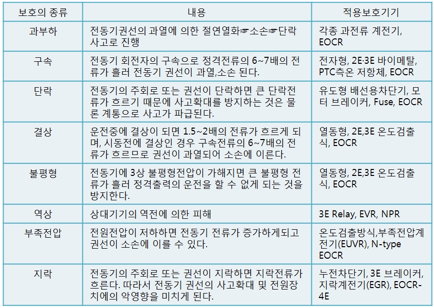 2) 전동기 보호의 종류 및 적용보호기기