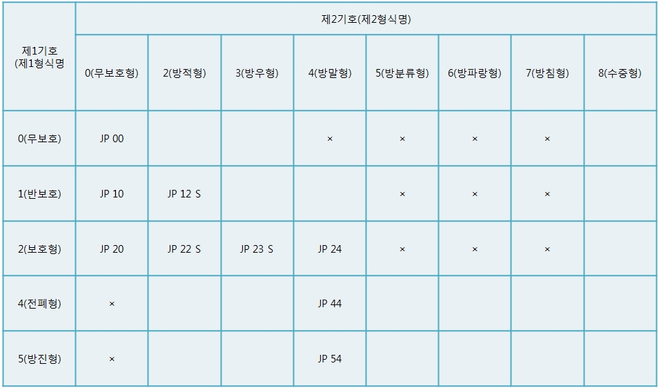 2. JP 00 및 JP 10은 각각 무보호형 및 반보호형이라 약칭할 수가 있다.
