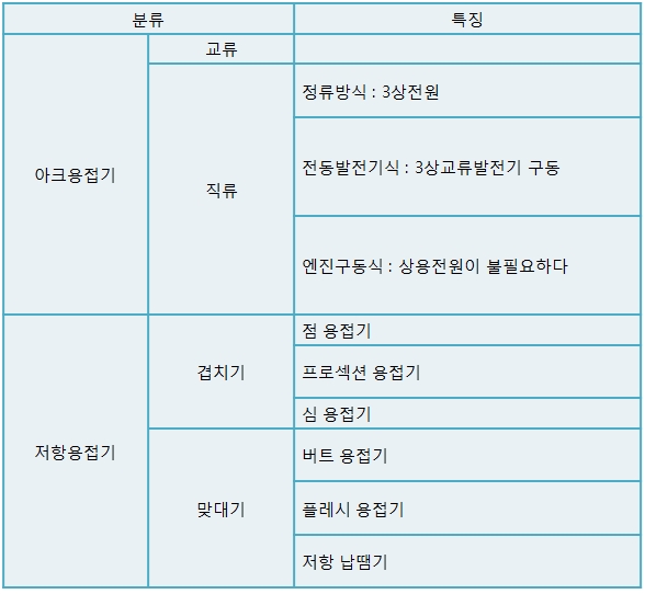 전기용접기는 용접의 원리, 용접방법 등에 따라 다양하게 분류되지만 전기적인 관점으로는 크게 아크용접기와 저항용접기로 구분한다.