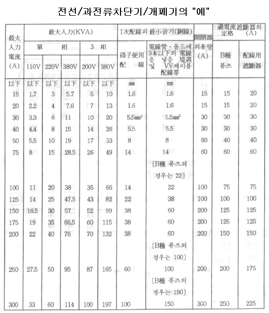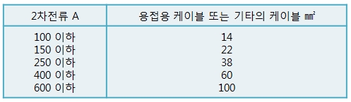 [표] 아크용접기의 2차측전선의 굵기(정격 사용률이 50% 인 경우)
