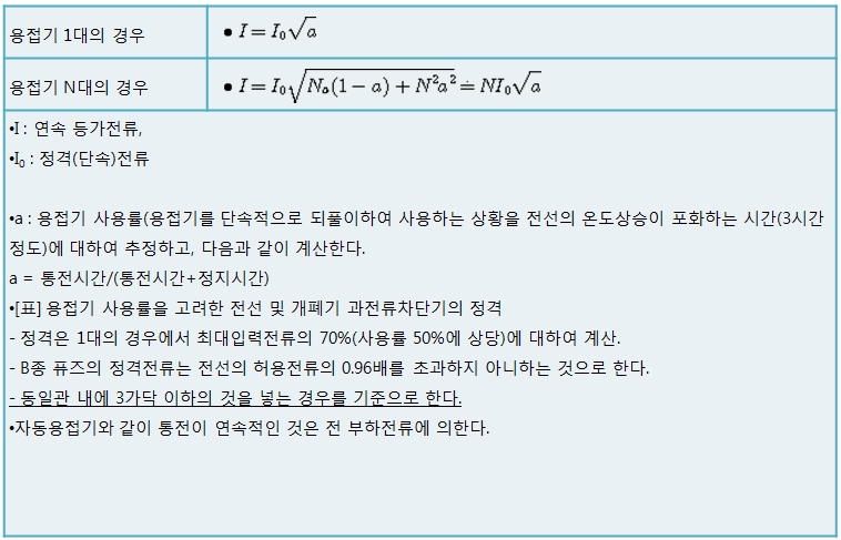 저항용접기 및 아크용접기에 공급하는 분기회로 및 간선은 용접기의 단속부하전류에 의한 등가열량과 동등이상의 전류용량을 가지는 전선,개폐기,과전류차단기를 사용하여야 한다. 이 경우 단속부하전류에 의한 전압강하가 다른 부하에 장해를 주지 아니하도록 충분한 주의를 하여야 한다. 또한 100KVA 이상의 대용량의 용접변압기는 전압강하제한 및 용접품질의 확보를 위해 용접기에서 30m 이내에 설치하는 것이 합리적이다.