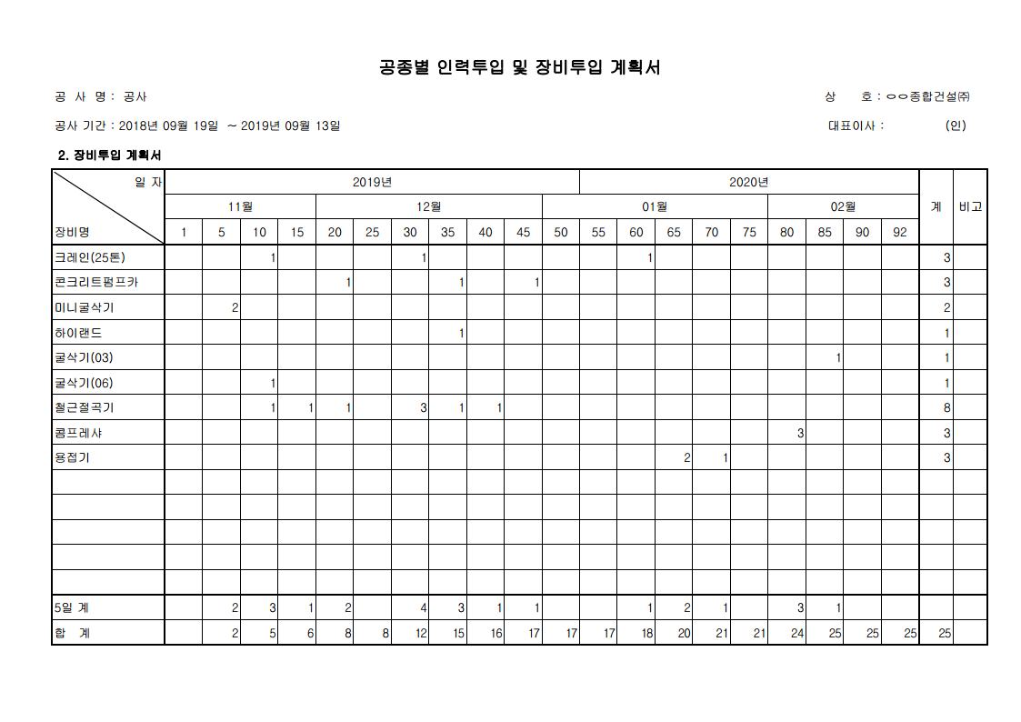 공정별로 인력 및 장비투입을 작성할때 쓰는 서식입니다.