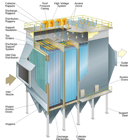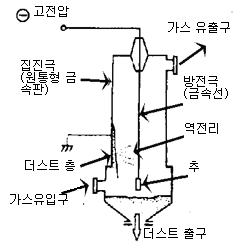 전기집진장치는 공기중의 분진을 방전극의 코로나 방전으로 전하를 주고 전계에서 집진극으로 포집하는 것을 기본원리로 해로운 먼지나 미립자 등을 모아 제거하는 장치