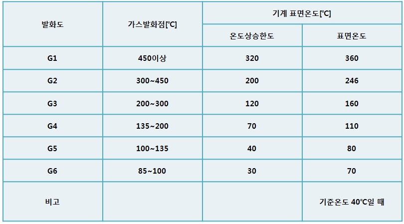 발화도는 폭발성가스의 발화점에 따라 표와 같이 6등급으로 분류한다. 예를 들어 아세틸렌 가스의 발화점은 350° 이므로 발화도는 G2이고, 온도상승한도는 발화점 하한값의 80%에서 기준주위온도 40℃를 뺀 것으로 200℃가 된다.