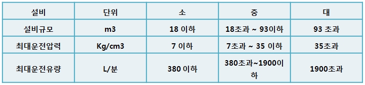 · 설비크기 및 운전 조건의 구별은 아래 표에 나타난 구분 중에 있다.