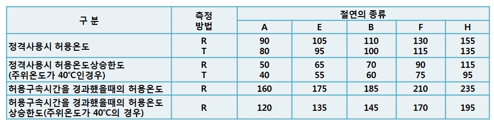 상기 표의 권선 온도 상승한도는 주위온도 40℃에서 정격부하운전시 저항법에 의한 방법을 적용했을 경우임