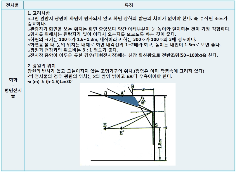 전시물과 주변의 휘도분포를 1/2~1/3정도로 유지.