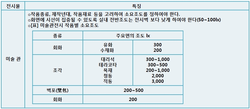 전시물에 대한 조명에 대해서는 높은 연색성, 모델링(적절한 그림자),수평면,연직면조도의 확보, 자외선에 의한 퇴색방지용 램프의 채택, 자연광의 유효이용 등이 중요하다.