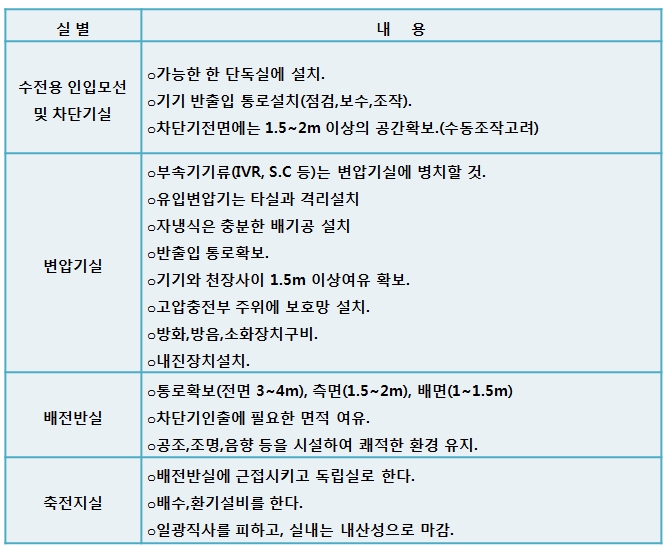 · 부특이 침수가 예상되는 경우에는 배수펌프를 계획할 것. 물탱크의 넘침(시수공급량)이 수변전실로 유입될 우려가 있는 경우에는 시수공급량 이상을 배수할 수 있도록 계획.