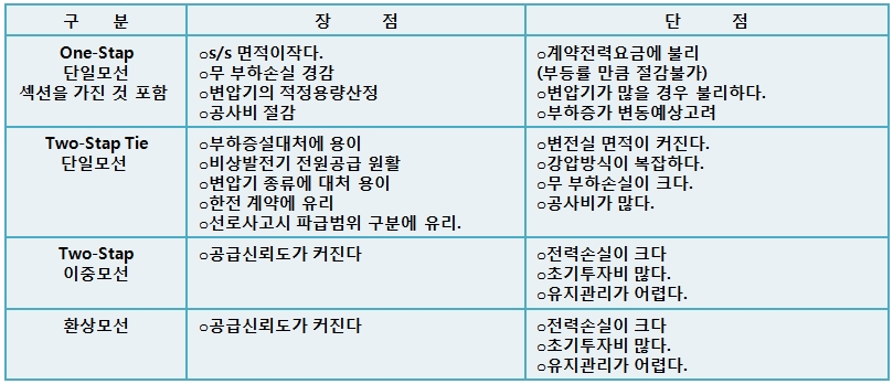 전력손실이 많다, 시설비가 비싸다, 보안성이 있다, 시설 소요면적이 크다, 단락용량이 커진다