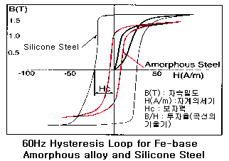 히스테리시스곡선은 자성체의 주요특성을 결정하며, 폐곡선의 단면적으로 히스테리시스손을 나타낸다. 아몰퍼스합금은 규소강판에 비해 보자력이 적고, 투자율이 높아 히스테리시스손이 작아짐을 나타낸다.
