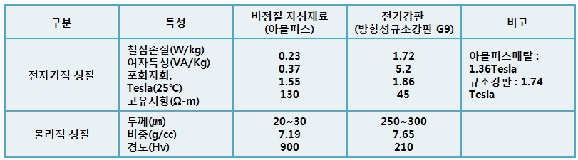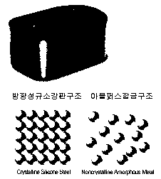 혼합물을 용융후 급속냉각(106℃/sec)시켜 만들어지는 비정질 자성재료로 되며 원자의 배열에 규칙성이 없는 랜덤구조이므로 히스테리시스손이 적고, 고유저항(규소강판의 3배)이 높고 두께(규소강판의 10%)가 얇아 와류손도 절감된다.
