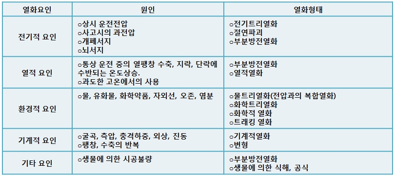 <표> 고 전압 CV케이블의 절연열화요인과 형태