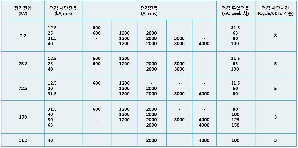따라서 차단기에는 정격전류와 정격전압, 정격차단전류가 있다, 정격전류라 하는 것은 전류를 연속해서 흘려도 각부의 온도상승이 규정 허용최대치를 넘지 않는 최대전류이고, 정격전압이라 하는 것은 지속적으로 견딜 수 있는 전압의 상한이다. 또 정격차단전류라 하는 것은 사고시의 고장전류를 차단 및 투입할 수 있는 한계전류치를 말한다.