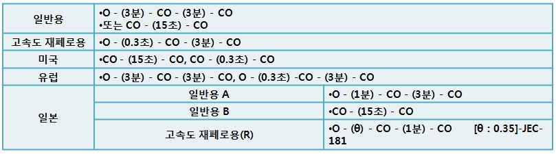 주로 저압차단기의 최대단락시험의 동작책무로 사용되며, 한번 차단<O>후 15초 후에 재투입 및 차단<CO> 시험을 수행할 수 있는 능력을 확인하는 동작책무임
