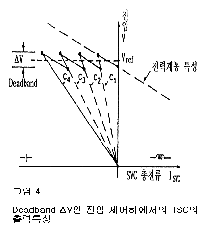 TSC 보상기의 출력특성(V-I)은 비연속적이며, 병렬연결 단위기의 수와 정격에 의해 결정된다. 따라서 공급된지지전압은 그림 4와 같이 불연속적이다.