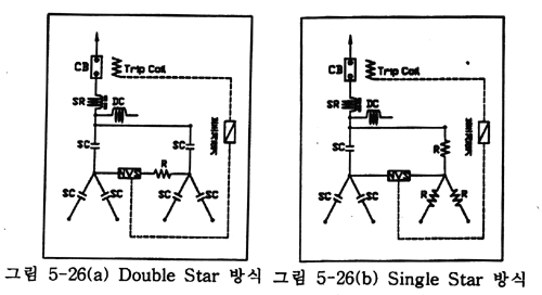 중성점 간 전류 검출방식과 유사한 특성을 가지고 있으며 NVS(Neutral Voltage Sensor)를 그림 5-26와 같이 결선하여 보호하는 방식으로 6.6kV, 3.3kV 계통에 널리 사용하고 있으며 콘덴서 Bank의 구성은 단상콘덴서 3대를 Y 결선하여 사용한다.
