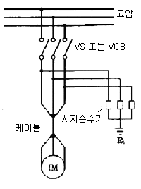 (차단기의 투입, 차단시에는 서지가 발생되며 경우에 따라서는 선로에 중대한 영향을 미치므로 전동기,변압기 등을 서지로부터 보호할 수 있는 서지흡수기의 설치가 권장되고 있으며 특히 몰드변압기 및 전동기에 VCB를 설치하는 경우에는 변압기의 보호를 위해 최근에는 반드시 설치하고 있다.)
