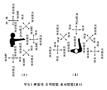 장치에 대하여 정상적 조작자세에 있어서 조작하는 사람의 바른편 방향에 있는 것을 "우", 왼편 방향으로의 조작을 "좌" 한다.