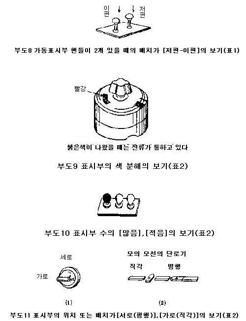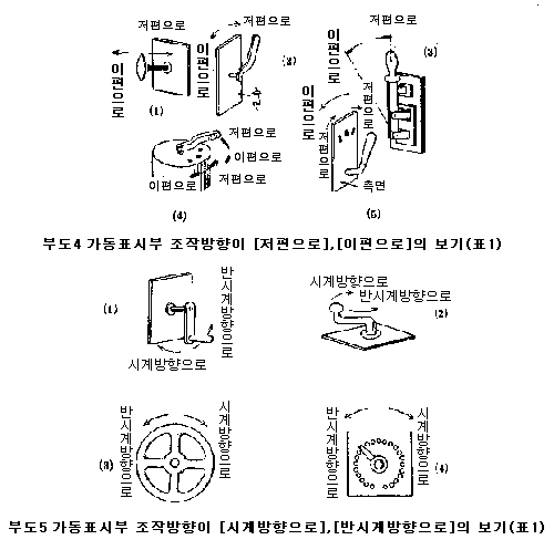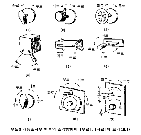 (3) 핸들과 한몸으로 된 회전원판에 눈금을 만들어 조작되는 양의 현재 값을 표시하는 것에 있어서는 핸들의 조작방향을 표1과 같이 하기 위하여 눈금의 진행방향이 보통의 계기와 반대로 되어 있어 표3에 적합하지 않으나 이것을 예외로서 인정한다.