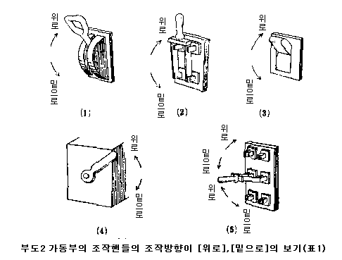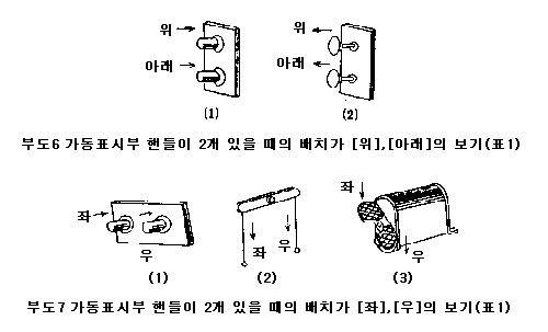 핸들이 조작방행 및 핸들이 두 개 있는 경우(조로 되어 있는 것, 이를테면 하나는 개로에, 하나는 폐로에 사용하는 것)의 배치는 표1에 표시하는 종류로 한다.