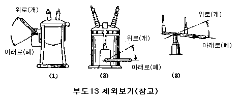 (1) 옥외용의 대형 개폐기 등에서 "폐"에 특별히 큰 힘을 필요로 하고, 체중 또는 팔의 힘을 이용하여야 할 경우에는 핸들의 조작방향이 표3의 반대로 되는 경우도 있으나 이것은 예외로서 인정한다(부도1 참조)