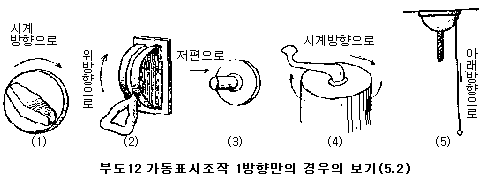 회전으로 인정되는 경우에는 핸들이 있는 방향에서 회전축으로 향하여 "시계방향" 및 "반시계방향"으로 한다.
