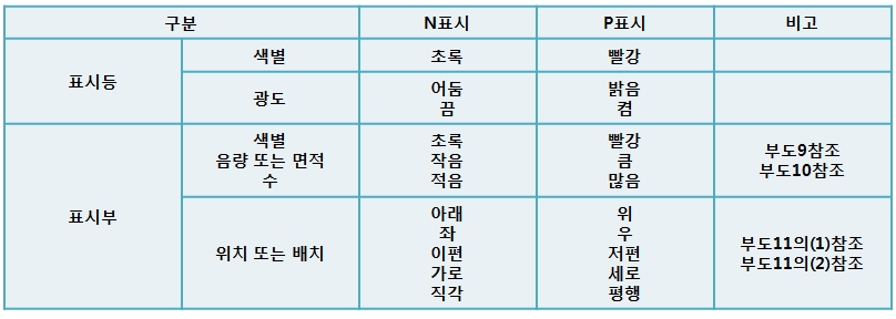 표시부의 위치 또는 배치는 표시에 정상적 감시자세에 있어서 머리부의 위치를 기준으로하여 이를 정한다(표1 비고2 참조)