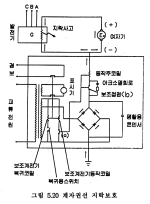 · 그림 5.20은 계자권선의 중간부근 지락사고를 고감도로 검출할 수 있는 방법이며 이 방식은 직류 중첩식으로 계자회로에 지락사고가 발생하면 지락개소와 검출장치의 접지개소 간에 직류 전류계전기를 통하여 전류가 흘러 검출계전기를 동작시킨다.