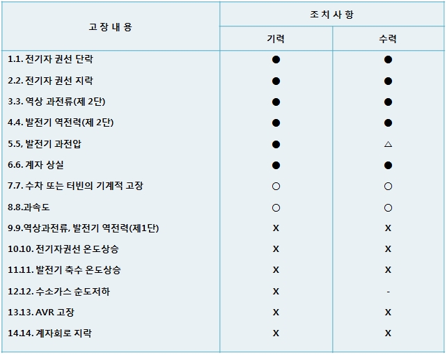 [표] 5.2 발전설비 보호항목과 조치
