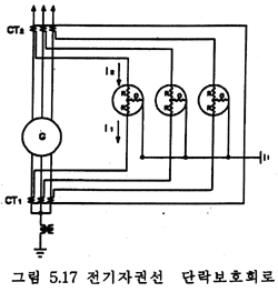 전기자 권선의 상간 단락보호에는 비율차동계전방식이 가장 일반적으로 사용되며 계전기의 접속방법은 그림 5.17과 같다.