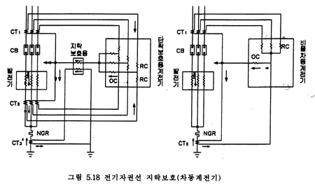 사고시 전류치가 적으므로 단락보호용의 차동계전기로서는 감도가 부족하므로 지락보호 전용의 차동계전기를 그림 5.18과 같이 사용한다.