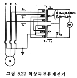 따라서 계전기는 역상필터와 장한시 유도원판형 계전기를 조합한 주체와 경보요소 등으로 구성되어 그림 5.22에서 결선내용을 볼 수 있다.