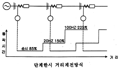 거리계전기는 여러가지 오차원인을 가지고 있으므로 100% 정확한 거리측정은 불가능하여 단독으로는 구간내외의 고장을 완전히 선택할 수 없으나 각 구간의 거리계전기 상호간에 적당한 시간차를 두어서 협조시키면 그림과 같이 상당히 고속도이고 고장구간의 선택성이 좋은 단계한시 거리계전방식을 만들 수 있다.